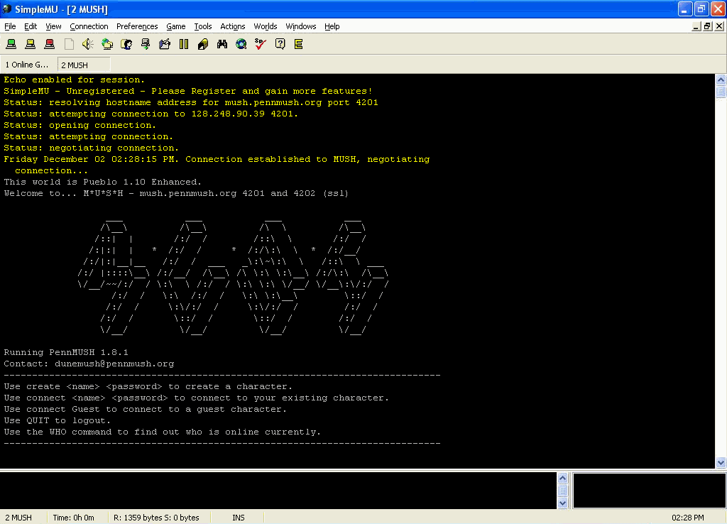 The login screen from M*U*S*H, the centre of development for PennMUSH.